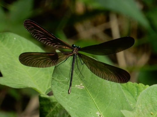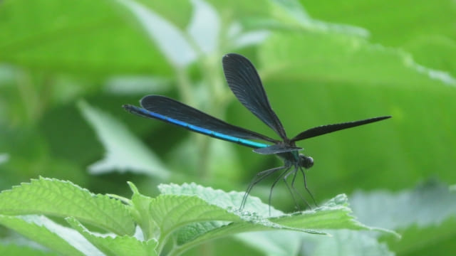 ハグロトンボは、羽が黒っぽく見えますが、光の当たり方によっては青や緑のような光沢が見えることがあります。