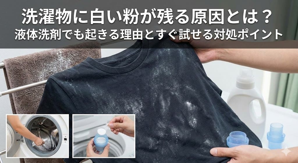 見た目には問題なく洗えているようでも、実際には衣類の内側や重なった部分に成分が残ってしまうことがあり、これが白い粉のように見える原因になる場合があります。